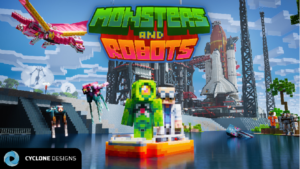 Venture through the island, but be careful to watch out for all the space monsters. There is a top secret UFO crash that occurred, and it is your job to look into it. Investigate the UFO crash site and defeat the robot guards in front of the mad scientist’s labs. Create your own secret base and see if you can challenge yourself to battle the robot dragon! Cyclone has included 6 skins in this mash-up pack.